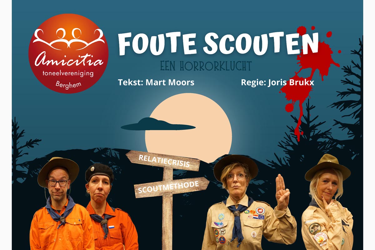 De voorstelling “Foute Scouten” is een komische horrorklucht en is geschreven door Mart Moors. De regie is in handen van Joris Brukx.