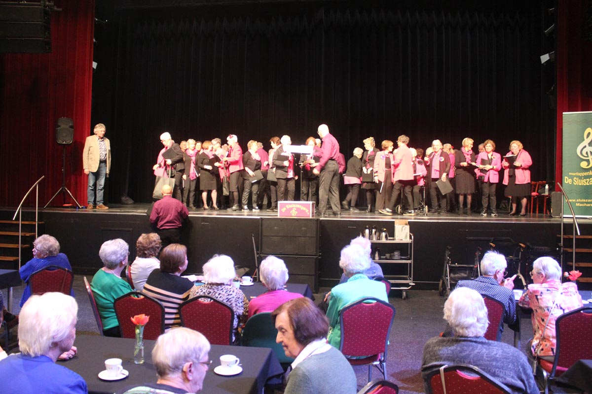 Om 13.30 uur start het middagprogramma in de ons zo vertrouwde Pas. Er staan heel wat tafeltjes opgesteld want veel mensen hebben zich voor deze middag aangemeld en als het programma dan start en je kijkt om je heen naar al die mensen die zijn gekomen, is dat toch wel een mooi compliment voor Jeanne, Annie en Frans van de Evenementencommissie. Deze middag is helemaal ingeruimd voor smartlappenkoor “de Sluiszangers” uit Macharen. Een behoorlijk grote groep bestaande uit sopranen, tenoren, bassen en alten en een dirigent die zelf de accordeon bespeelt én de liedjes introduceert. En na een woord van welkom door Piet Ceelen, kan deze muzikale reis beginnen. Allerlei bekende meezingers komen langs en we zingen vrolijk mee. Ondertussen zijn de tafels afgeruimd en kunnen de bestellingen worden opgenomen. Alles is goed geregeld en wij hoeven alleen maar te genieten…hoe fijn is dat!! “Dans nog eenmaal met mij”, “Save the last dance for me” en het alom bekende lied “Que sera” van Doris Day….we kennen de teksten allemaal nog.