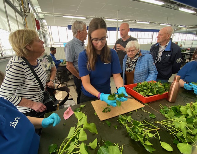 De KBO-deelnemers gingen in 2 groepen naar de kassen; een groep met hovenier Dennis v. Orsouw, de andere groep met Rob v.d. Leest. We zagen medewerkers stekjes in orde maken; anderen waren bezig om die in bakjes te plaatsen. Van wel 1000 soorten planten worden stekken geoogst. De groeitijd tot de stekken geworteld zijn, verschilt erg veel: taxusstekken meer dan 10 maanden, een hortensiastek maar 4 tot 5 weken.