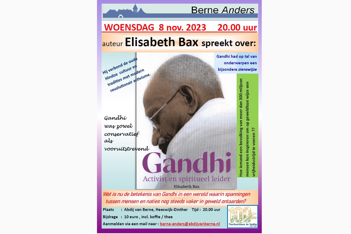 Op woensdag 8 november komt Elisabeth Bax in de Abdij van Berne spreken over het boek dat zij geschreven heeft: ’Gandhi, activist en spiritueel leider’. Op haar reis door India zag en hoorde zij hoe de idealen van Gandhi, 75 jaar na zijn dood, nog steeds springlevend zijn. Hij werd en wordt beschouwd als een ‘goeroe’, een leraar.
