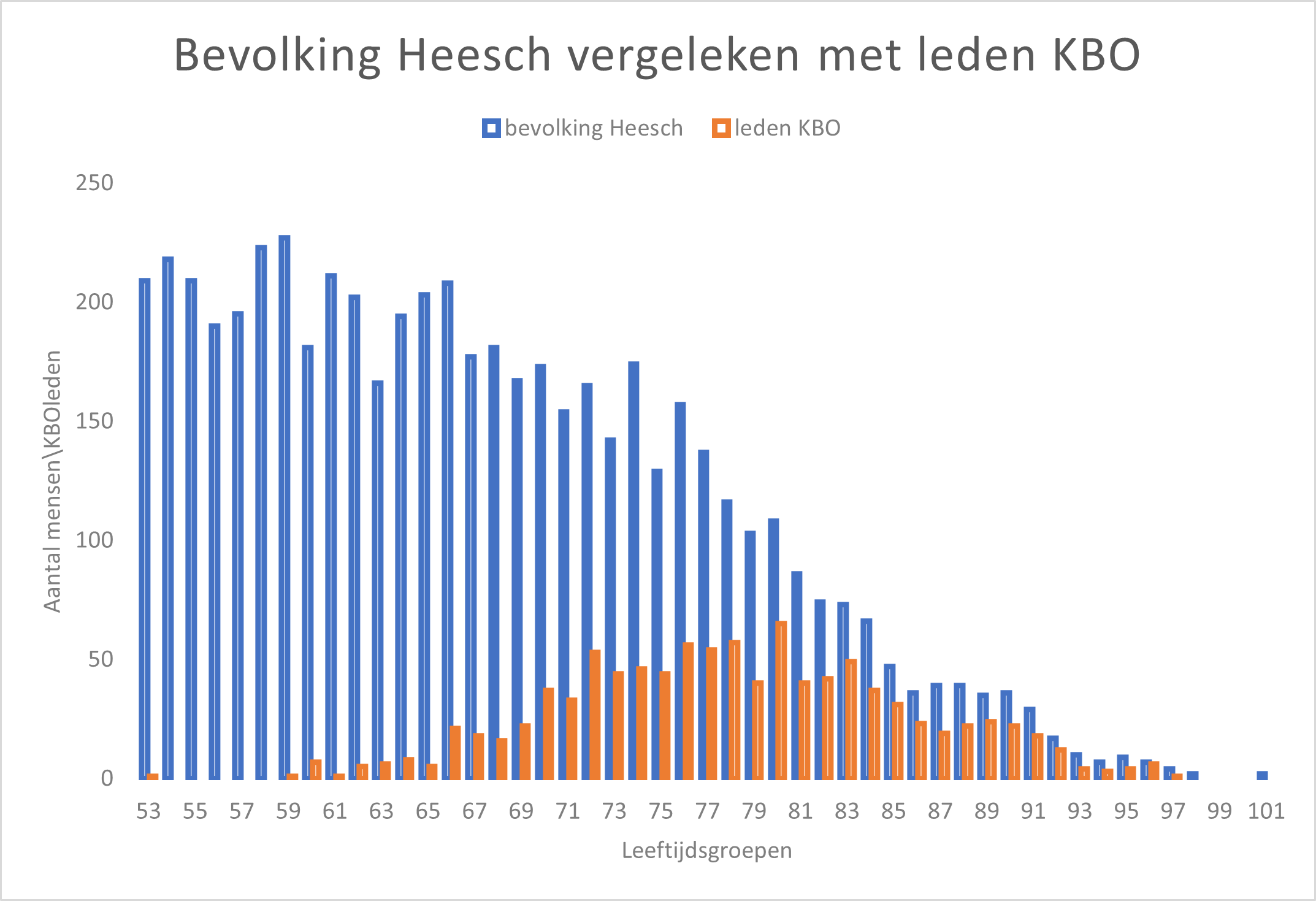 Om te weten wat ons te wachten staat in die periode is gekeken naar de bevolking van Heesch. De KBO Heesch wil er zijn voor alle senioren van Heesch – vooralsnog richten we ons op iedereen boven 50 jaar. Op dit moment zijn dat ruim 6000 mensen; komende 5 jaar komen er daar ruim 600 bij. We hebben in Heesch ruim 1000 leden bij de KBO. Dat betekent dat ongeveer één op zes inwoners van onze doelgroep lid zijn van de KBO. Maar deze leden zijn niet ‘eerlijk’ verdeeld over alle leeftijdsgroepen. Dat zien we als we de bevolking van Heesch naast de KBO-leden leggen (bijgaande grafiek). We zien dan dat bij de 80-jarigen bijna twee-derde lid is van de KBO, terwijl van de 67-jarigen (de leeftijd waarop tegenwoordig iedereen met pensioen gaat) net aan 10% lid is. Het streven is om deze scheve verdeling iets rechter te maken. Momenteel is de gemiddelde leeftijd van onze leden ruim 79 jaar. Afgelopen jaar zijn er 62 mensen lid geworden van de KBO. Gemiddeld waren deze leden rond 72 jaar. De aanmeldingen lijken zo te bevestigen dat KBO Heesch er vooral is voor de 70-plussers, ‘echte bejaarden’. Terwijl de KBO er ook wil zijn voor de 70-minners. Het bestuur wil in de komende beleidsperiode inzetten op verjonging van ons ledenbestand. Concrete plannen dienen nog verder ontwikkeld te worden, dus wie ideeën heeft mag dat graag melden.