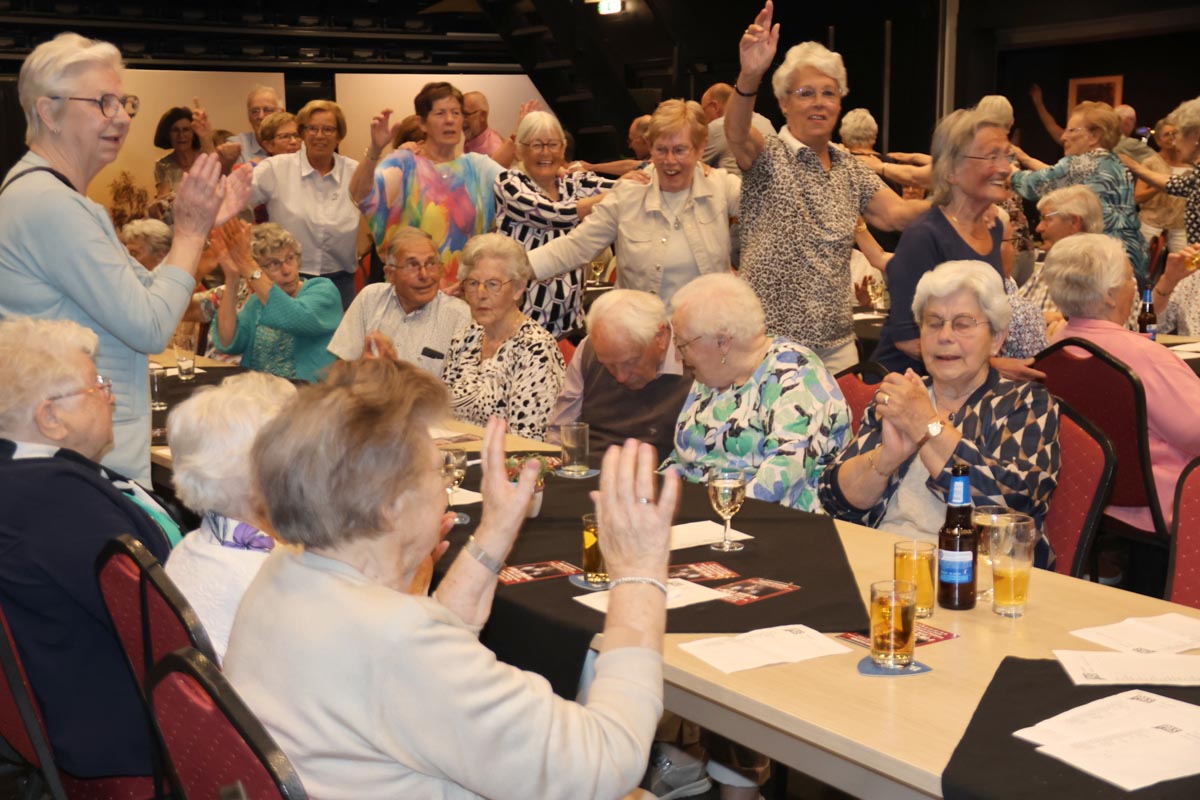 Zo, wat gezegd moest worden is gebeurd en nu gaan we genieten van een heerlijk samen-zijn vol muziek, gezelligheid en vrolijke gezichten. De dansvloer ligt er uitnodigend bij en is al snel gevuld en zo hoort dat ook. De koffie- en theekopjes zijn opgeruimd, de koeken opgegeten en de eerste drankjes rondgebracht. We zingen mee, lopen de polonaise, zwieren over de dansvloer en zelfs de twist wordt enthousiast en met veel vuur gedanst. Het grote lichtkanon schiet enkele keren een regen van lichtjes de lucht in, zó leuk! Er worden snacks op de tafels gezet en we genieten volop. Tegen het einde wordt het bestuur op de dansvloer gevraagd en gaan wij, de leden, hand-in-hand om hen heen staan en deinen we allemaal mee op de muziek. Weer zo’n mooi samen moment.