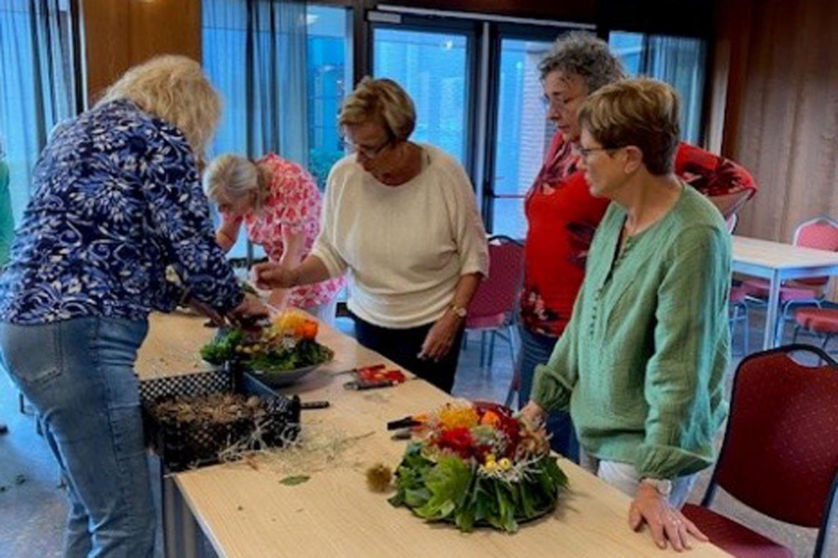Op maandag 29 september en donderdag 2 oktober werd er weer met veel plezier gewerkt aan een herfststuk onder leiding van Nicolien Banken. Op een ronde schaal wordt eerst oase gelegd, waarop vervolgens mos aan de zijkant rondom de oase vast gezet wordt. Daarna gaan we eikenbladeren dubbelvouwen en aan een ijzerdraad rijgen, waarna deze over het mos bevestigd worden Hierna gaan we de bovenkant bekleden met o.a. oranje lampionnetjes, sedum , hortensia, gerbera, roosjes en protea. Ondertussen wordt er volop gekletst en halverwege de les koffie en thee gedronken. Al met al weer een gezellige middag met als resultaat een mooi herfststuk en tevreden deelnemers.