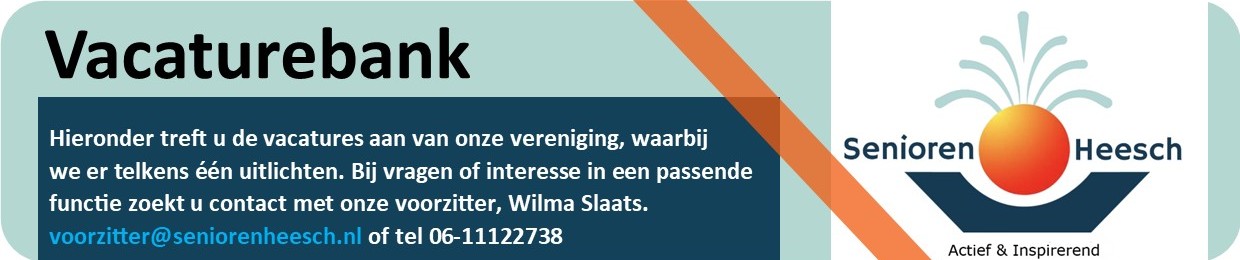 Senioren Heesch is een actieve en inspirerende vereniging en door haar ambities permanent op zoek naar versterking op diverse fronten. Door dit terugkerende artikel willen wij onze leden maandelijks op de hoogte houden van onze vacaturebank, waarin telkens één vacature nader wordt uitgelicht.